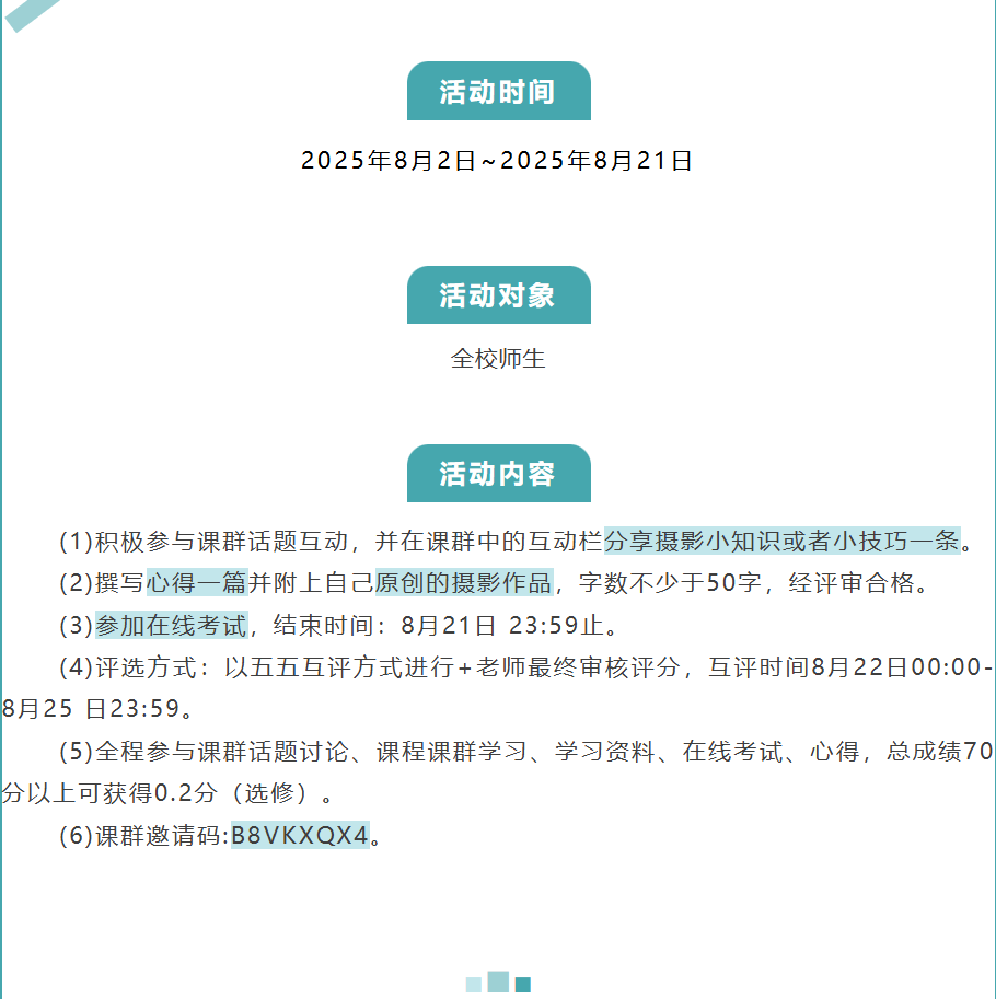 学习不仅仅是知识的输入,更需要互动和交流。在 “光影筑梦” 课群中,你将结识一群志同道合的摄影爱好者,大家来自不同的专业、不同的年级,但都怀揣着对摄影的热爱。在这里,你可以分享自己的摄影作品,听取他人的意见和建议,互相学习、共同进步;可以参与各种有趣的摄影话题讨论,激发创意灵感;还可以参加课群组织的线上线下摄影活动,在实践中锻炼自己的摄影技能,与其他学员一起用镜头记录美好的瞬间。