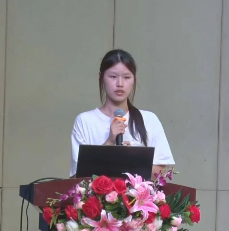 新生代表谭志怡同学上台发言,表达对大学生活的期待与未来学习的决心,她的发言真挚而充满朝气,道出了所有2025级同学对大学生活的期待与志向。