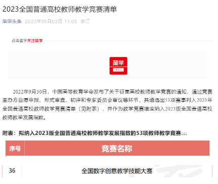 第八届全国数字创意教学技能大赛全国数字创意教学技能大赛(National Competition for Digital Creative Teaching Skills,缩写:NCDCTS)获教育部中国高等教育学会(简称 “高教学会”)关注,入选高教学会发布的全国普通高校教师教学竞赛榜单赛事,并被纳入该学会《全国普通高校教师教学竞赛分析报告》,在高校教师技能竞赛领域已形成广泛影响力,受到教师群体的普遍关注与积极参与。